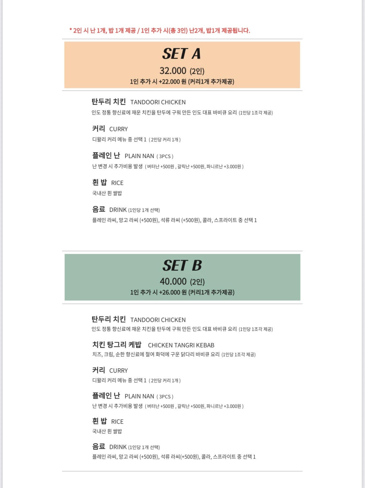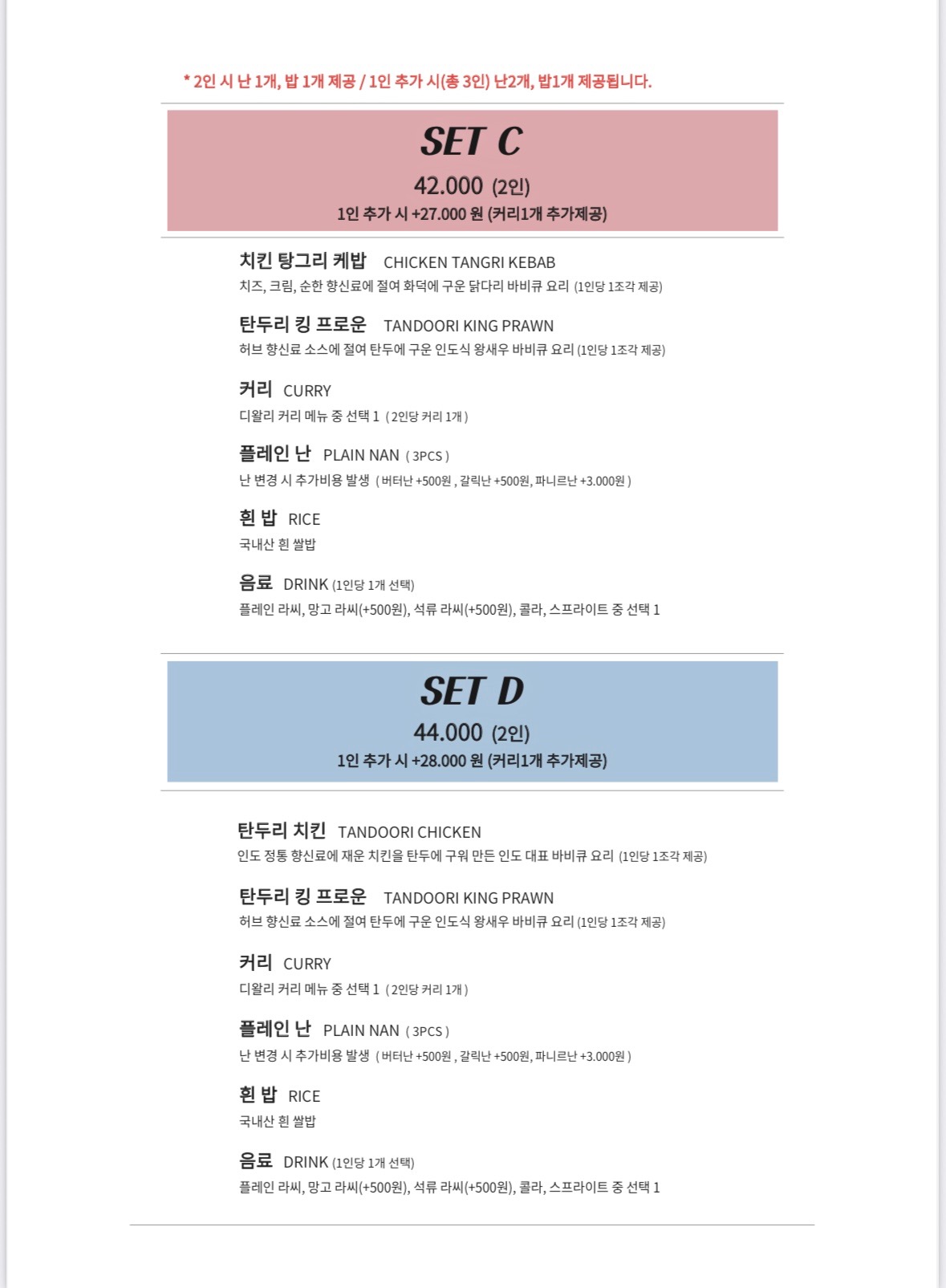 - 주메뉴: 탄두리치킨2pcs 10,000 | 팔락파니르 13,500 | 치킨마크니 13,500 | 비프말라이파산다 14,000 | 프로운칠리 14,000 | 고스트카다이 14,000 | 플레이 난 2,000 | 라씨 4,000