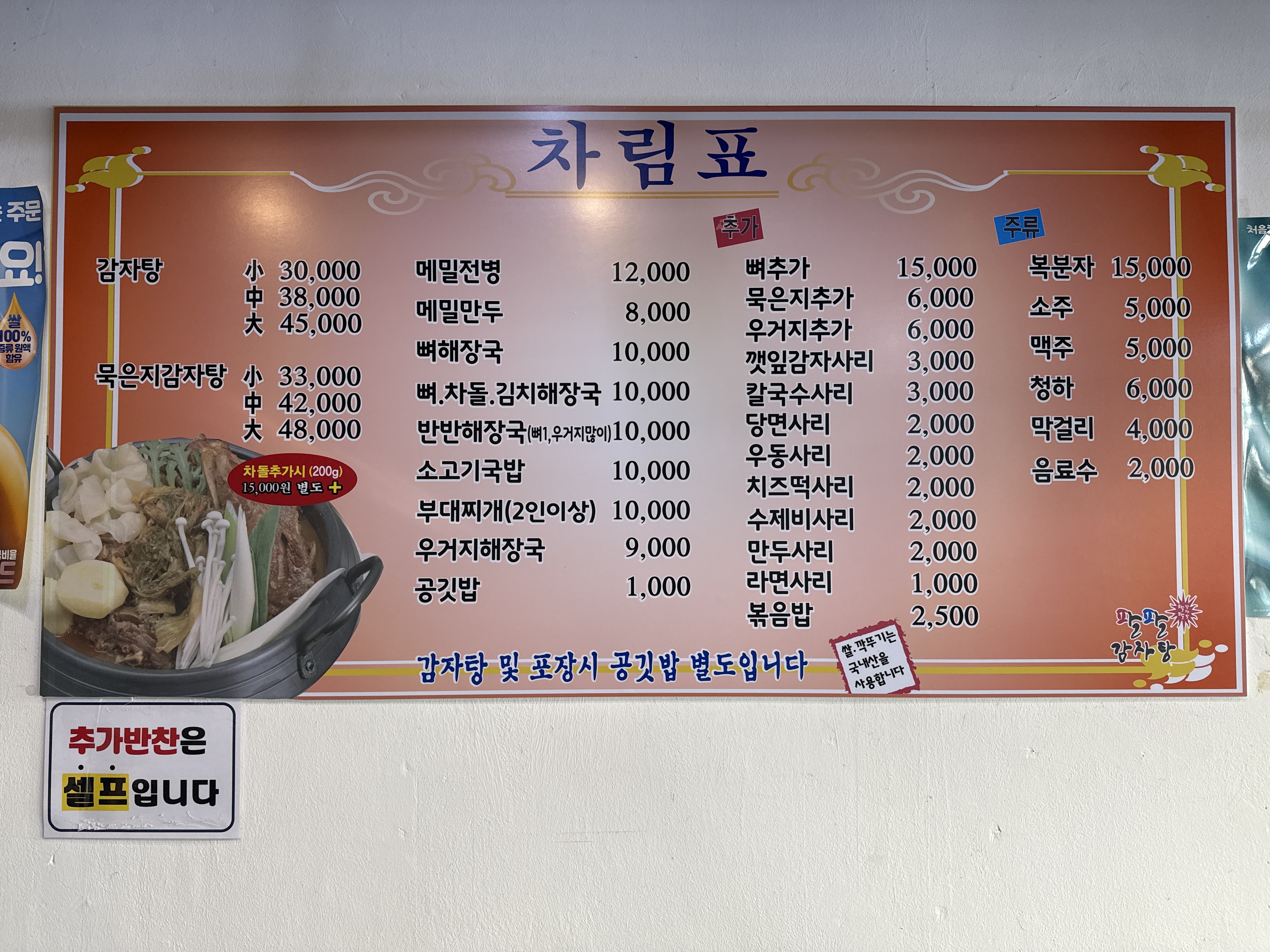 - 주메뉴: 뼈해장국 10,000 | 감자탕 소(2인) 30,000 | 감자탕 중(3인) 38,000 | 감자탕 대(4인) 45,000 | 묵은지감자탕 소(2인) 33,000 | 묵은지감자탕 중(3인) 42,000 | 묵은지감자탕 대(4인) 48,000 | 우거지해장국 9,000 | 차돌김치해장국 10,000 | 소고기국밥 10,000 | 부대찌개(1인 기준) 10,000 | 메밀만두 8,000 | 메밀전병 12,000 | 각종 사리 변동가격(업주문의)