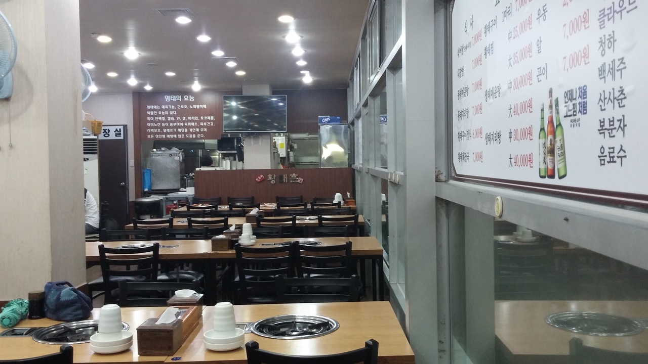 - 주메뉴: 섞어탕 9,000 | 동태매운탕 9,000 | 동태지리탕 9,000 | 황태해장국 9,000 | 황태구이정식 11,000 | 황태찜 중 35,000 | 생태지리탕 중 35,000 | 내장탕 9,000 | 황태구이 1마리 10,000 | 황태찜 대 45,000 | 생태매운탕 중 35,000 | 생태매운탕 대 45,000